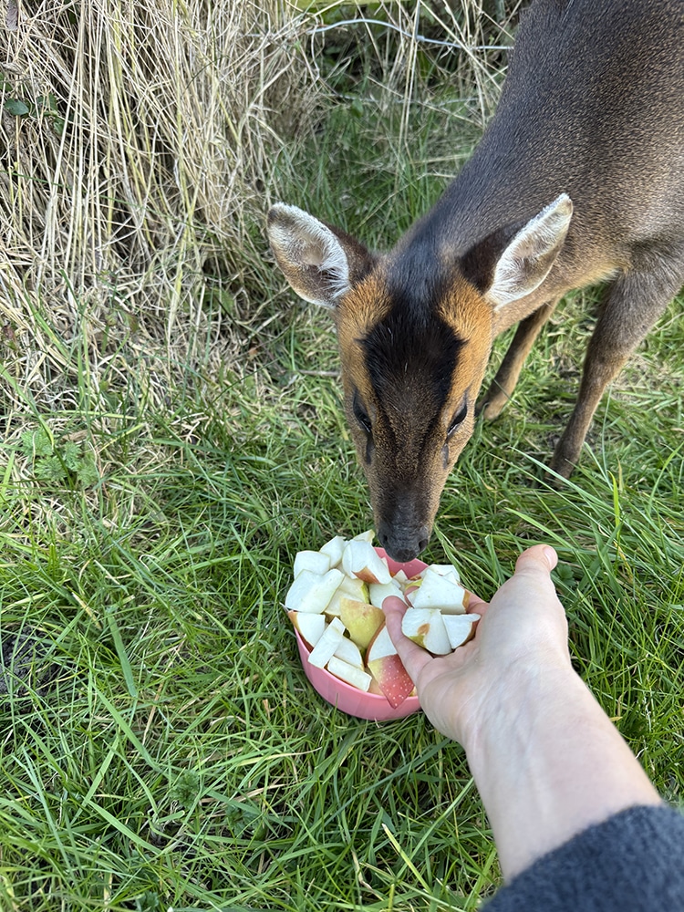 I live in Holkham village, and over the last few years I’ve befriended a wild muntjac deer who frequently visits my garden. On my day off I rest in the garden and she inevitably comes along to say hello and to get something nice to eat from me. She has become more tame over time and even comes into the house to my kitchen!