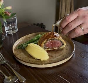 Estate venison wellington with truffle mash, local asparagus and game jus