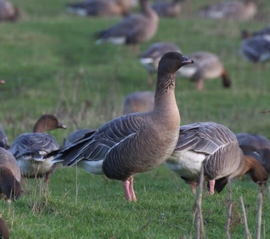 The Pink-footed Goose is a medium sized goose with pink legs and feet